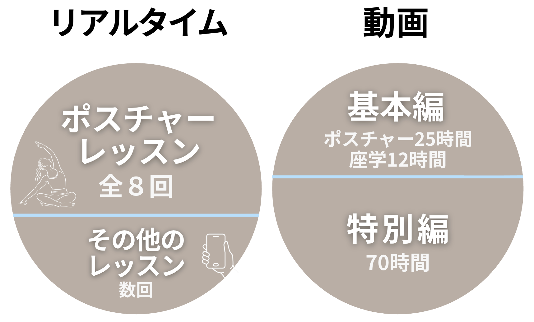基本動画:20ポーズを実践解説(約10時間)、解剖学、生理学、呼吸法などの座学(約5時間)